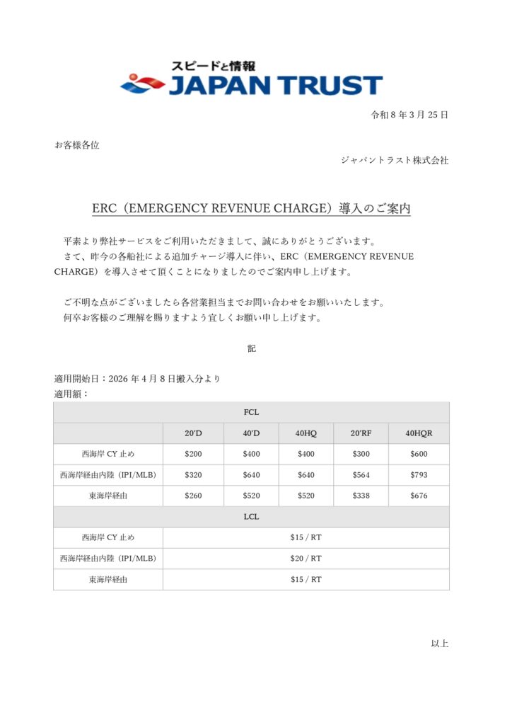さて、昨今の各船社による追加チャージ導入に伴い、ERC(EMERGENCY REVENUE CHARGE)を導入させて頂くことになりましたのでご案内申し上げます。